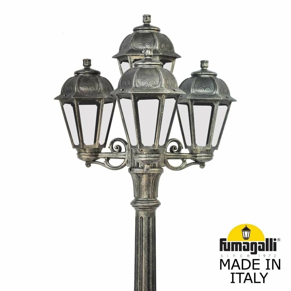 Садовые светильники - столбы Fumagalli серии SABA, модель SABA /ARTU/BISSO 3+1. Парковый торшер, столб ARTU с тремя уличными фонарями SABA на трех малых консолях BISSO и четвертым светильником на опоре. Используются для архитектурного и ландшафтного освещения в стиле "классика". Место установки столбиков освещения - парковые дорожки, скверы, садовые участки, тротуары, а так же ландшафтные и архитектурные объекты. Могут устанавливаться и внутри помещений в качестве декоративных уличных фонарей. Изготовлены в Италии, по уникальным технологиям "Fumagalli" из современного композитного полимера RESIN. Этот материал в 5 раз прочнее металла, не ржавеет, не окисляется, не выгорает на солнце, его не нужно красить. Все светильники пыле-влаго защищены по стандарту IP44 (защита от попадания твердых частиц более 1 мм, защита от капель или брызг, падающих под любым углом). Рассеиватель выполнен из антивандального, не мутнеющего и не горючего PMMA (ПолиМетилМетаАкрилат).
