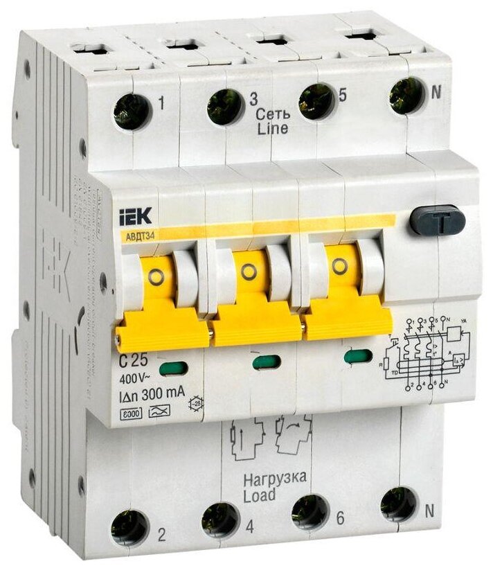 АВДТ34 MAD22-6-025-C-300 Автоматический выключатель дифференциального тока трехполюсный+N 25А (тип A 6 кА) Упаковка (3 шт.) IEK