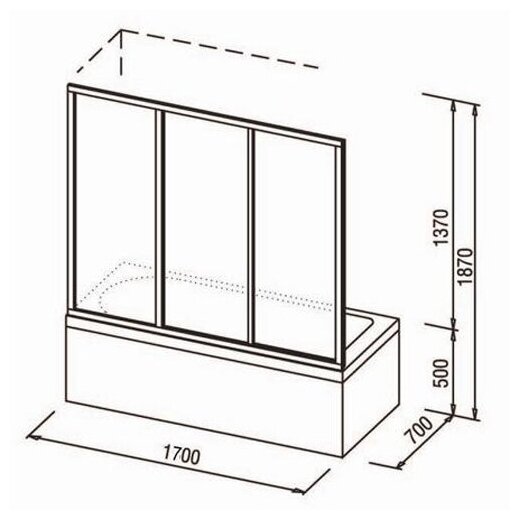 Изделие состоит из одной неподвижной и двух подвижных частей. Конструкция составлена из толстостенных алюминиевых профилей с качественной поверхностной обработкой и максимальной герметичностью. Двери устанавливаются на прямоугольные ванны (Classic, Sonata, Campanula II, Vanda II и Lilia) или на какую-либо классическую прямоугольную ванну с ровным передним бортом. Стандартная высота шторы 1370 мм.