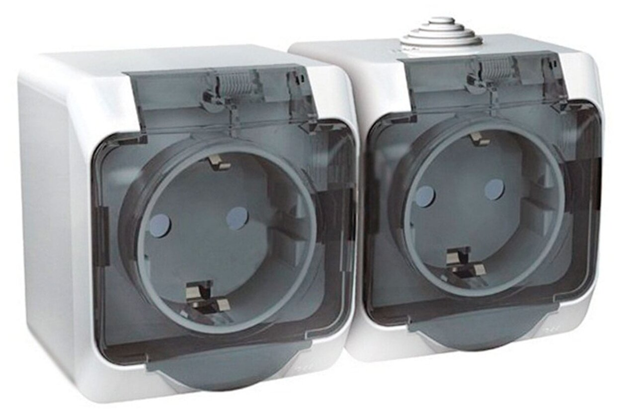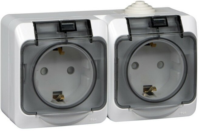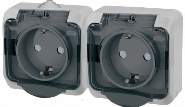Этюд PA16-244C Розетка двойная с заземляющим контактом шторками и крышкой (16 А в сборе открытая установка IP44 серая) Schneider Electric