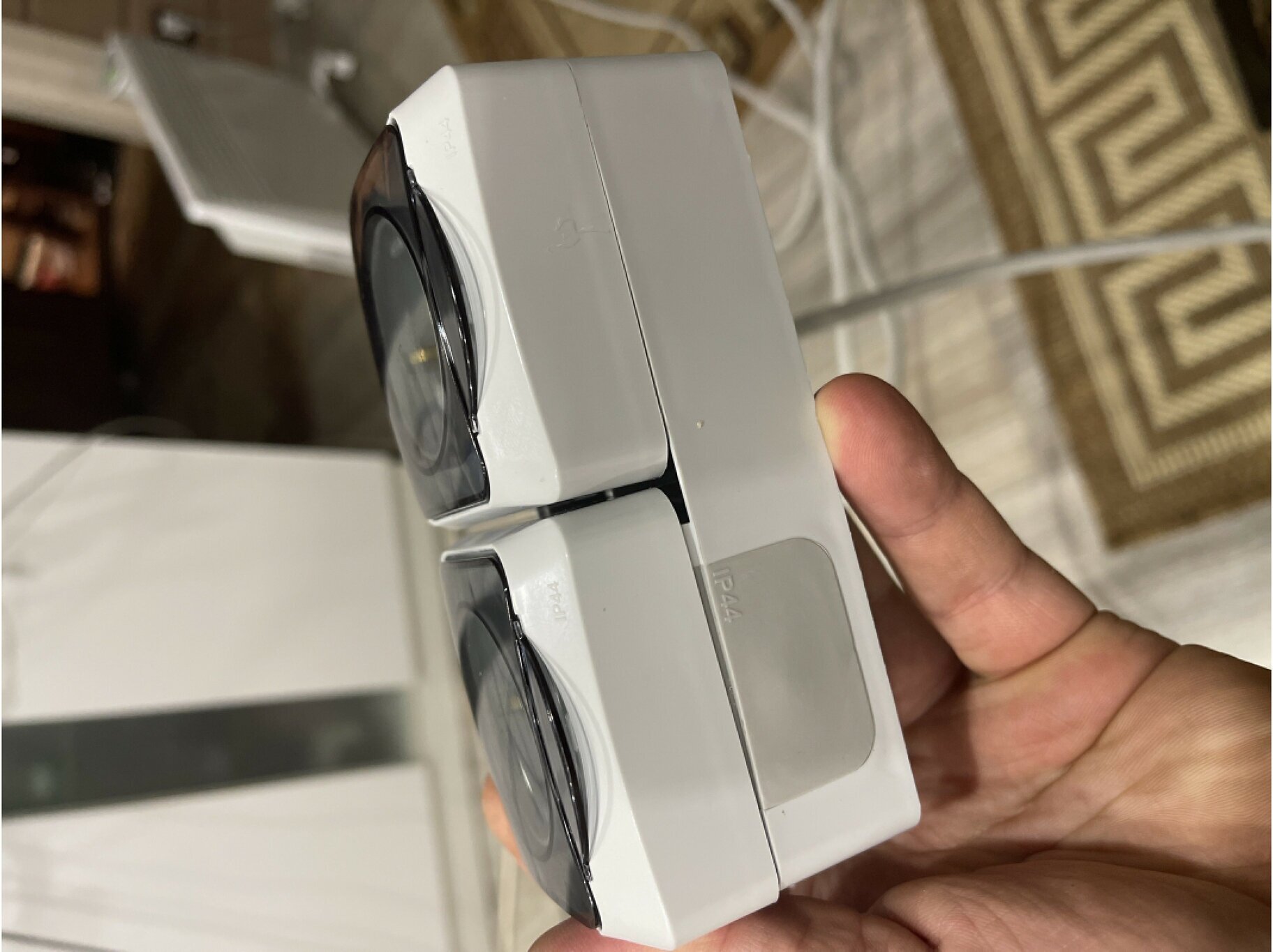Хороший немного глянцеый пластик, легко разбирается. Каждая из двух половин снимается отдельно с задней части, которая крепится к стене на 2 витнта, вертикально или горизонтально. Ровная геометрия, без огрехов. Снизу тоже есть резиновая вставка для ввода кабеля, правда немного более жёлтого оттенка чем пластик.