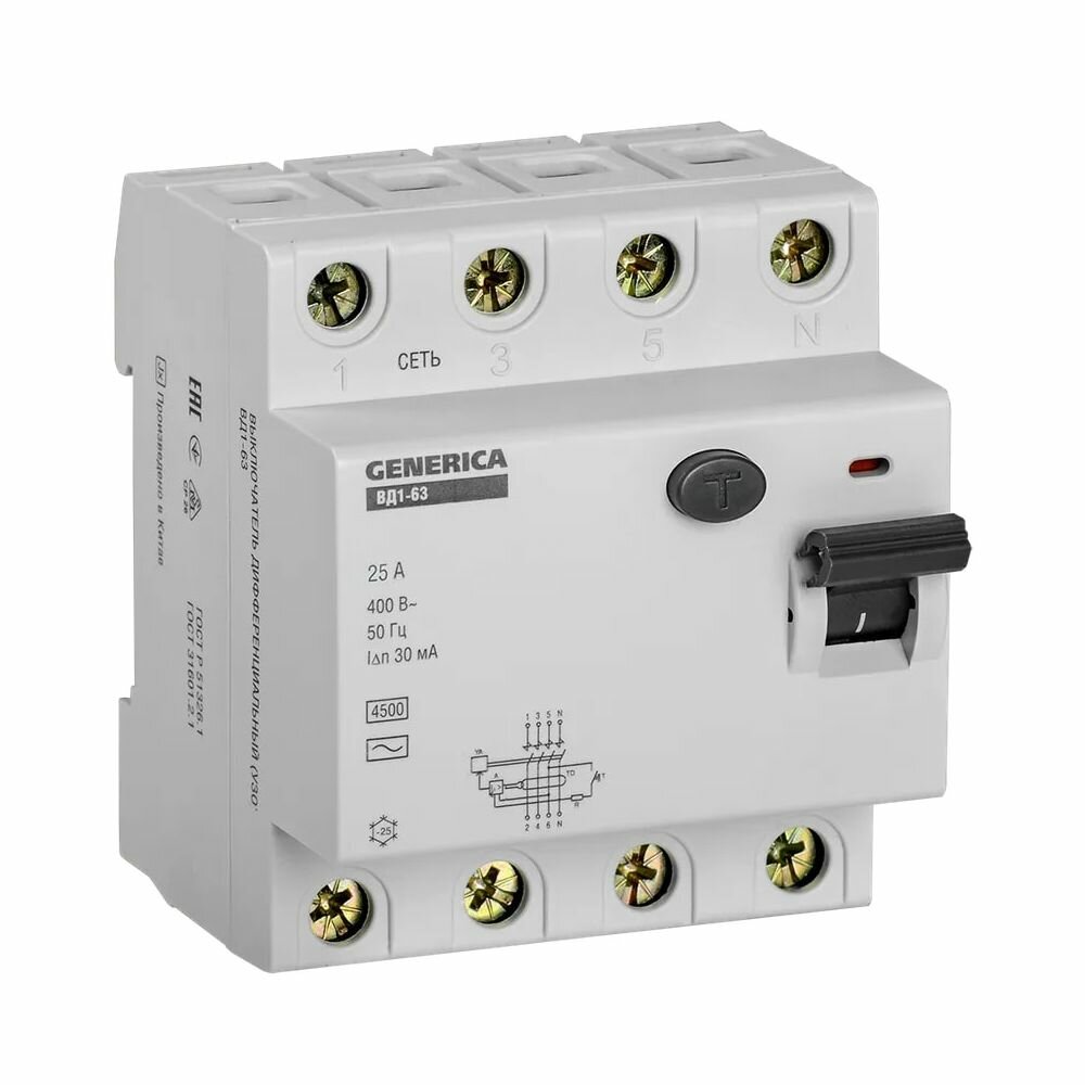 Generica MDV15-4-040-030 Выключатель дифференциального тока четырехполюсный 40А 30мА (тип AC) IEK