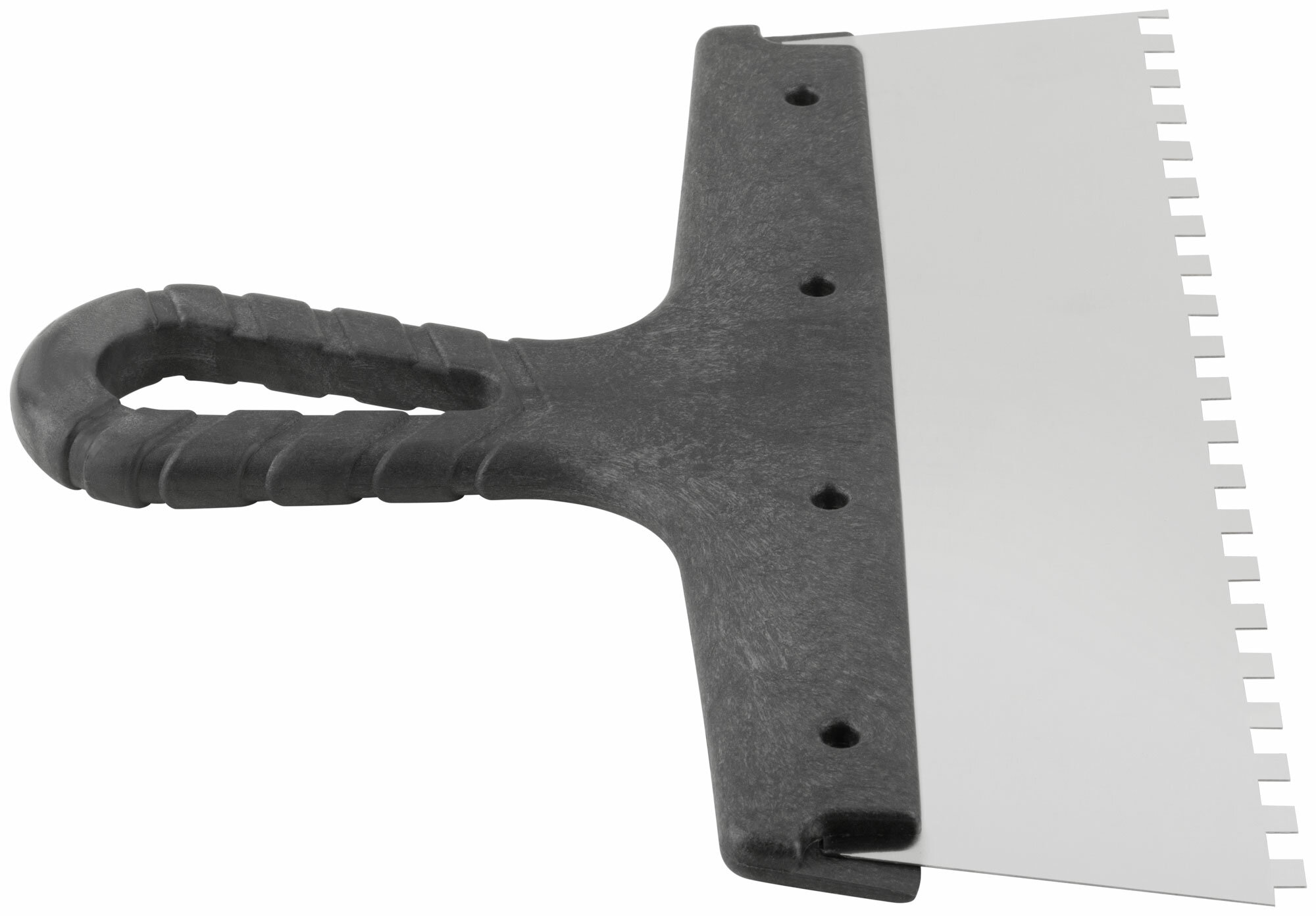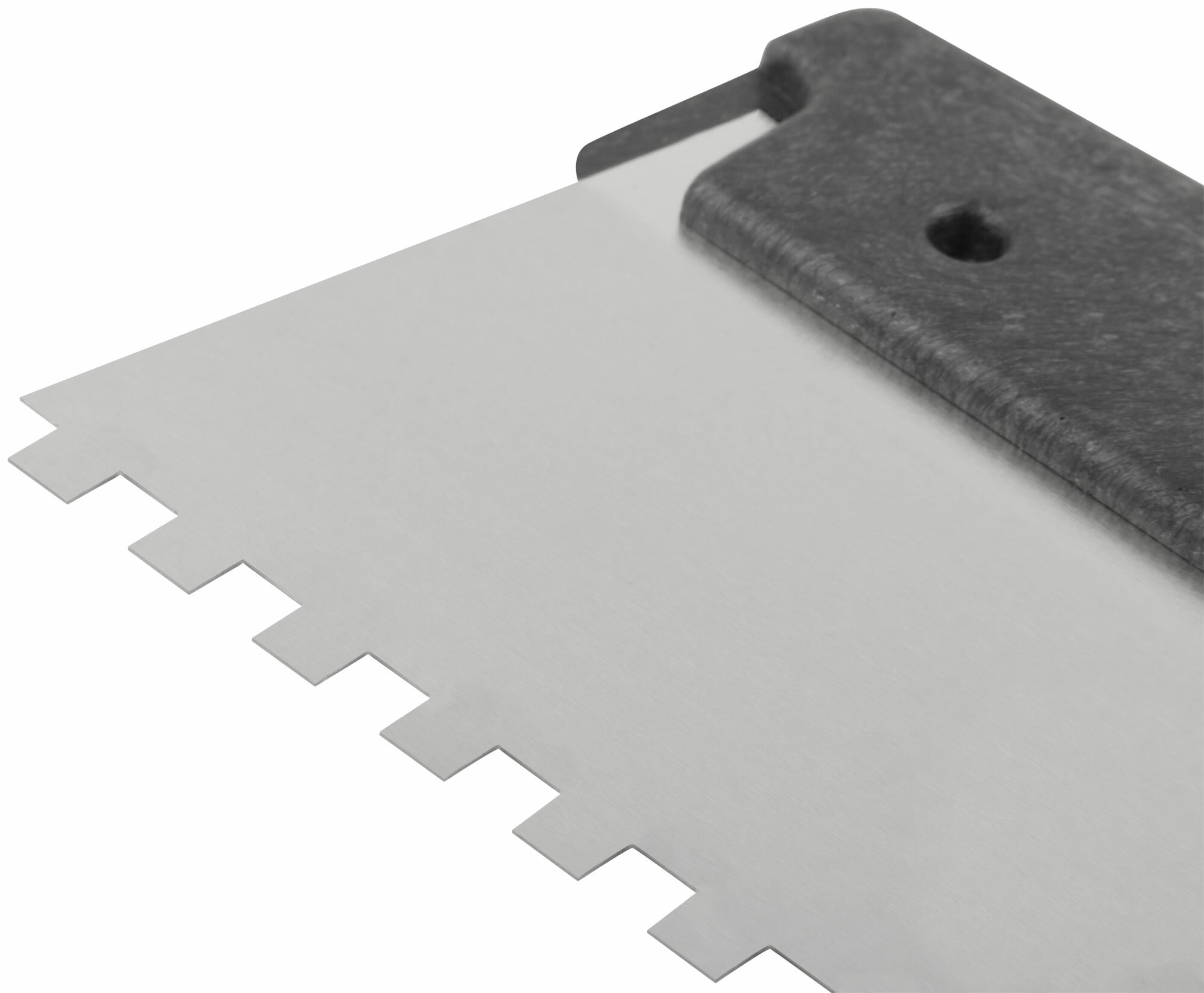 Зубчатый. Для работы на поверхностях большей площади. Материал: нержавеющая сталь, пластиковая ручка.