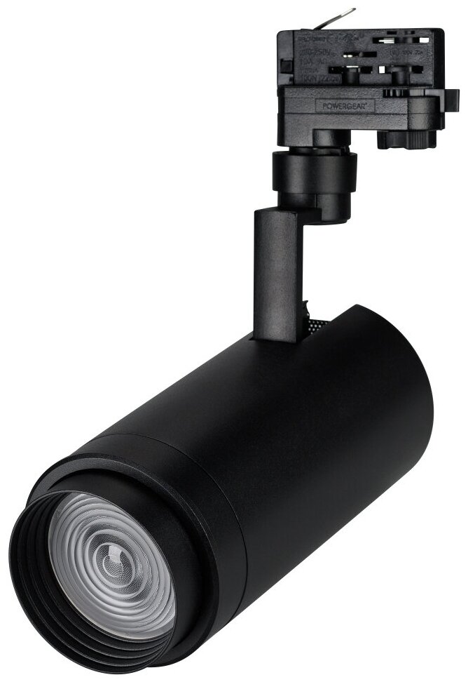 Светильник подвесной для треков/шин 4 провода. Корпус круглый, металл, цвет черный. Регулируемый угол 20-60°. Драйвер встроенный (30-40V, 750mA).