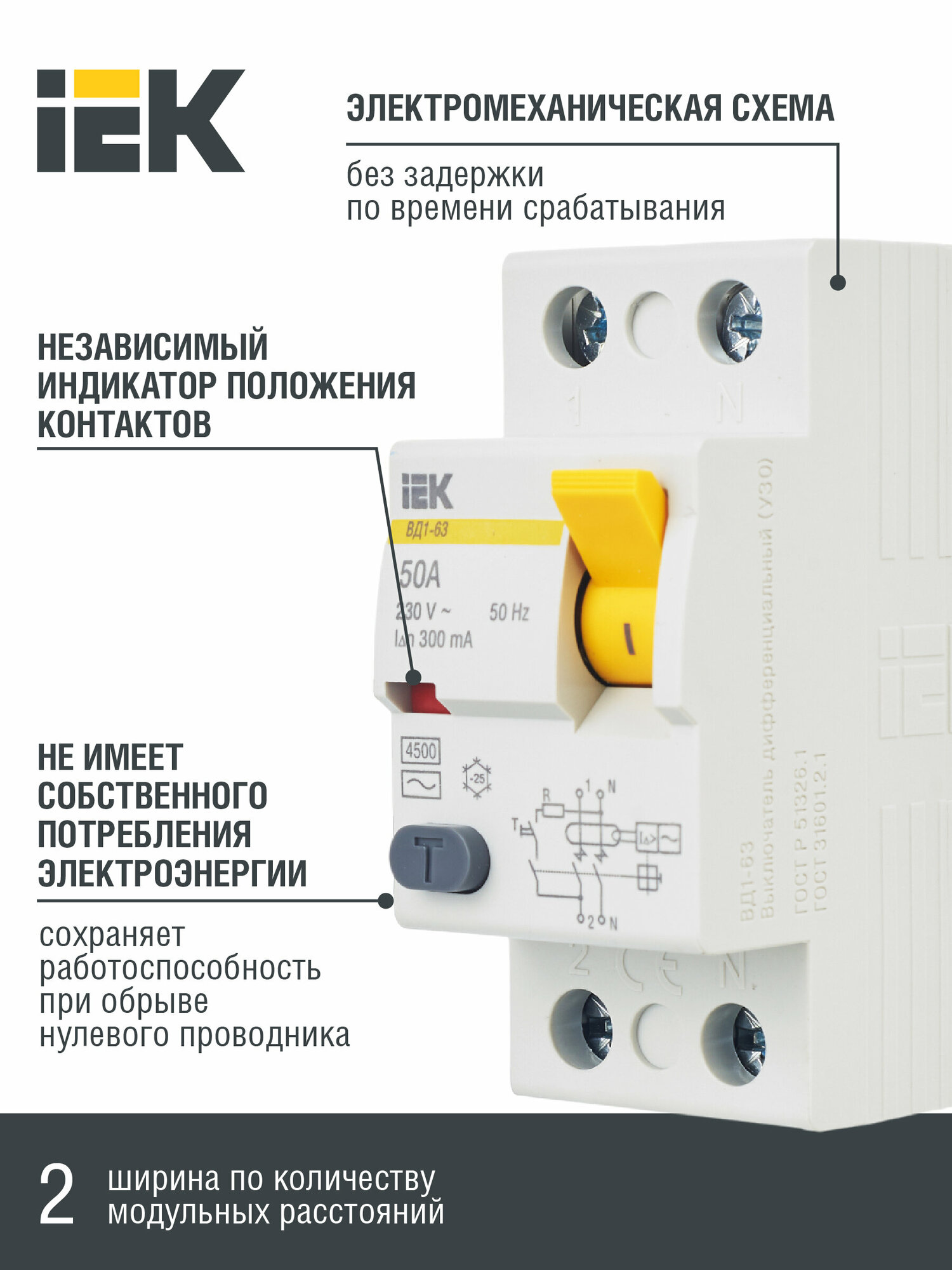 ВД1-63 MDV10-2-050-300 Выключатель дифференциального тока двухполюсный 50А 300мА (тип AC) IEK