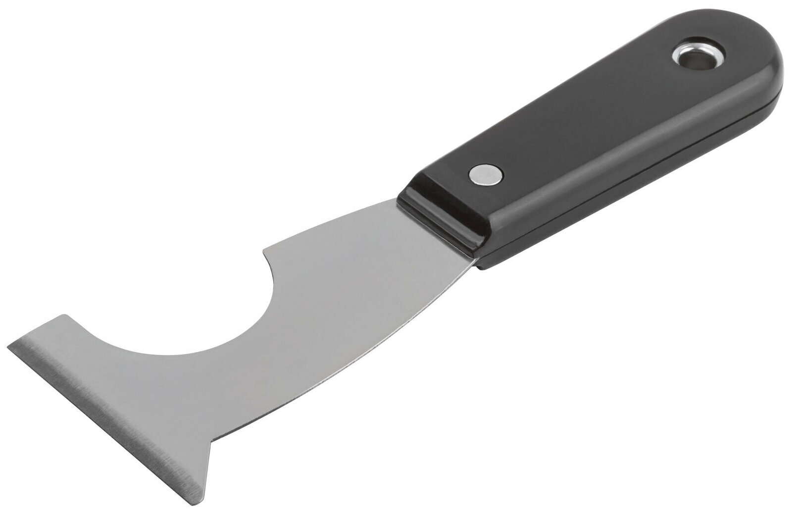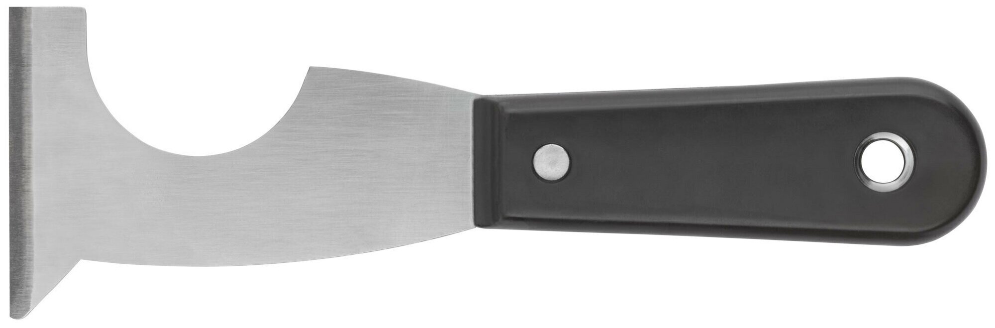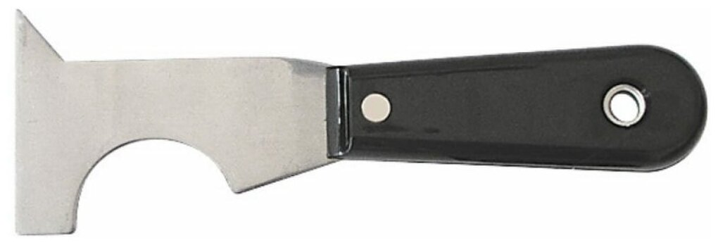 Стальное лезвие с заточенной гранью позволяет использовать шпатель для очитски от старой краски, ржавчины и грязи плоских поверхностей, труб, пазов, щелей.