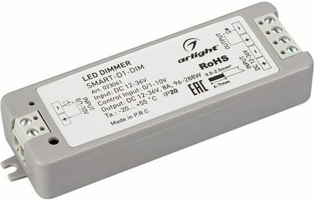 Диммер для одноцветных источников света (0/1-10V). Питание/рабочее напряжение 12-36VDC, входной/выходной ток 8А, выходная мощность 96-288W. Корпус - PVC. Габариты 97х33х18 мм. Управляется 0/1-10V панелями серии SMART (поставляются отдельно).