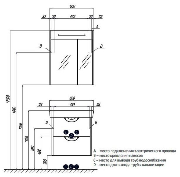 Дополнительно предусмотрено нижнее подключение труб водоснабжения и канализации.