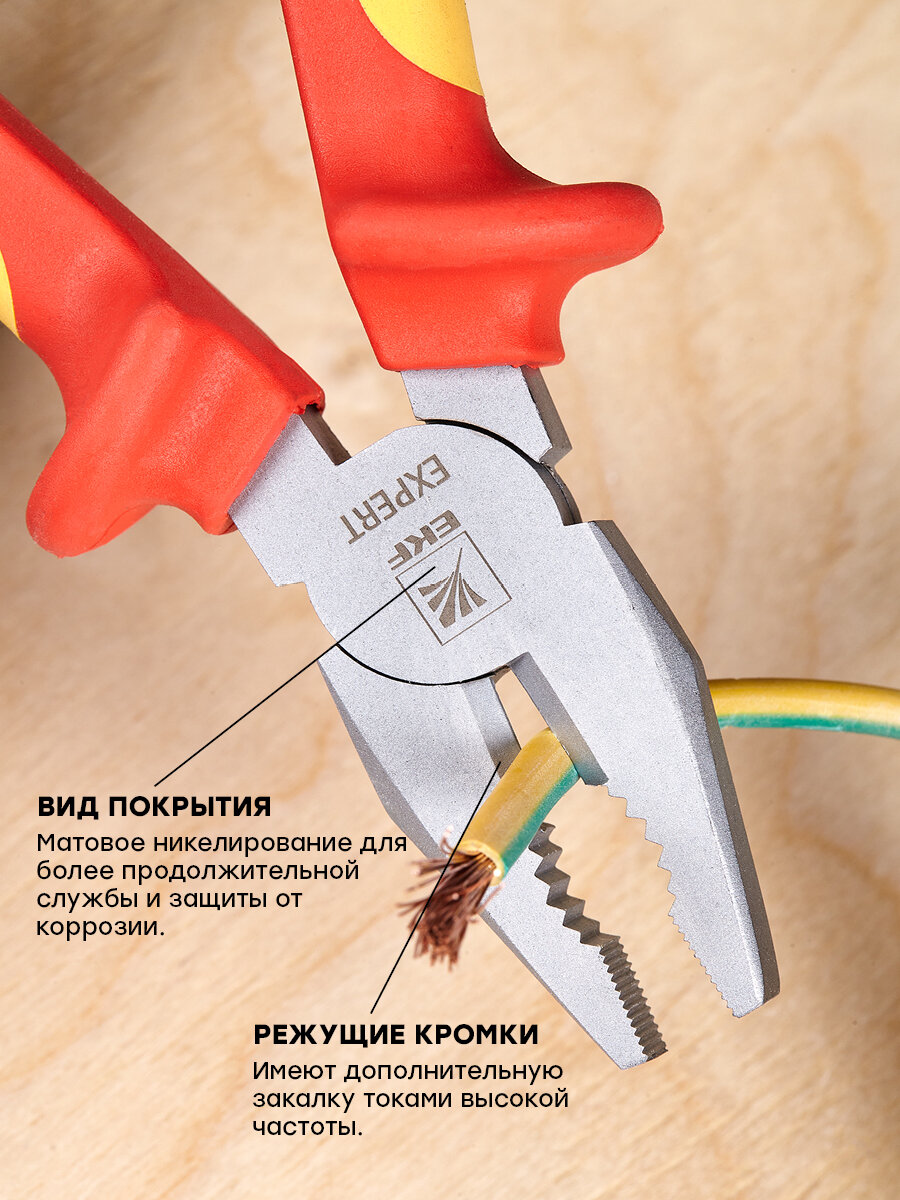 ОПИСАНИЕ. Диэлектрический шарнирно-губцевый инструмент – большая группа изделий, необходимых для проведения работ под напряжением до 1000 В. Инструмент серии Master имеет диэлектрическое покрытие (изоляцию), нанесенное методом погружения. Инструмент серии Expert имеет насадную диэлектрическую изоляцию с элементами защиты от соскальзывания. ПРЕИМУЩЕСТВА. Материал рабочей части: инструментальная хром-ванадиевая сталь. Поверхность: матовое никелирование. Режущие кромки дополнительно закалены токами высокой частоты HRC 62. Высококачественный материал и отличная эргономика рукояток. Упоры для защиты от соскальзывания, обеспечивают удобный хват и рычажное усилие, необходимое для осуществления реза. Expert – серия инструментов с улучшенными эксплуатационными характеристиками, которые проходят дополнительную обработку и контроль при производстве. Соответствие нормам IEC 60900:2004. ПРИМЕНЕНИЕ. • Пассатижи используют для захвата и удержания плоских и цилиндрических деталей, проводов и элементов крепежа. Наличие режущей кромки позволяет откусывать проволоку и зачищать провода. • Бокорезы предназначены для разрезания проволоки, проводов,гвоздей, прутьев. Различаются по форме и размеру рабочей части. • Кабельные ножницы применяют для резки медных или алюминиевых проводов/кабелей. • Длинногубцы/Длинногубцы изогнутые используются для захвата и удержания мелких элементов, проволоки, колец, винтиков и выполнения различных работ в труднодоступных местах. • Круглогубцы применяют для закручивания или выпрямления проволоки и тонких металлических изделий. • Клещи переставные предназначены захвата и опрессовки деталей, сгиба труб, демонтажа винтовых соединений и т. д.
