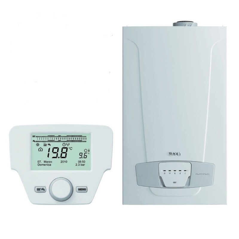 Производительный уникальный бытовой газовый конденсационный котел BAXI LUNA PLATINUM+ предназначается для настенного монтажа и с высокой эффективностью применяется в самых разнообразных условиях в любое время. Агрегат имеет новейшее интуитивное управление, не производит вредных выбросов и отличается стабильностью и низким потреблением топлива. Особенности и преимущества: -Система адаптивного контроля горения; -Коэффициент модуляции мощности — 1:10; -Сохранение номинальной мощности при падении входного давления газа до 5 мбар; -Прогрессивный модуляционный циркуляционный насос со встроенным автоматическим воздухоотводчиком; -Новая съемная панель управления с широким дисплеем и встроенным датчиком температуры (опционально беспроводная); -Электронный манометр — срабатывает при падении давления воды в 2 этапа: предупреждение и блокировка; -Электрический трехходовой клапан с мотором(в том числе в одноконтурных моделях). Газовая система: -Система адаптивного контроля горения; -Коэффициент модуляции мощности — 1:10; -Сохраняют номинальную мощность при падении входного давления газа до 5 мбар; -Непрерывная электронная модуляция пламени в режимах отопления и ГВС; -Пониженное содержание со и NOx; -Горелка из нержавеющей стали AISI 316L с предварительным смешением газа и воздуха; -Возможна перенастройка для работы на сжиженном газе. Гидравлическая система: -Прогрессивный модуляционный циркуляционный насос со встроенным автоматическим воздухоотводчиком; -Электронный манометр; -Первичный теплообменник из нержавеющей стали AISI 316L; -Вторичный пластинчатый теплообменник из нержавеющей стали (двухконтурные модели); -Встроенный электрический трехходовой клапан с мотором (в том числе в одноконтурных моделях); -Автоматический байпас; -Постциркуляция насоса; -Фильтр на входе холодной воды; -Возможность подключения внешнего накопительного бойлера для горячей воды. Температурный контроль: -Новая съемная панель управления с широким дисплеем и встроенным датчиком температуры (опционально беспроводная); -Два датчика температуры отопления на подаче и на обратке; -Самоадаптация погодозависимой автоматики; -Возможность недельного программирования режима работы; -Диапазон регулирования температуры в системе отопления 25 — 80°С; -Встроенная погодозависимая автоматика; -Регулирование и автоматическое поддержание заданной температуры в контурах отопления и ГВС; -Цифровая индикация температуры и давления; -Возможность управления разнотемпературными зональными системами. Устройства контроля и безопасности: -Электронный манометр - срабатывает при падении давления воды в 2 этапа: предупреждение и блокировка (0,5 бар); -Управление каскадом до 16 котлов; -Электронная система самодиагностики и запоминание последних ошибок в работе; -Ионизационный контроль пламени; -Системы защиты от блокировки насоса и трехходового клапана; -Защитный термостат от перегрева теплоносителя в первичном.