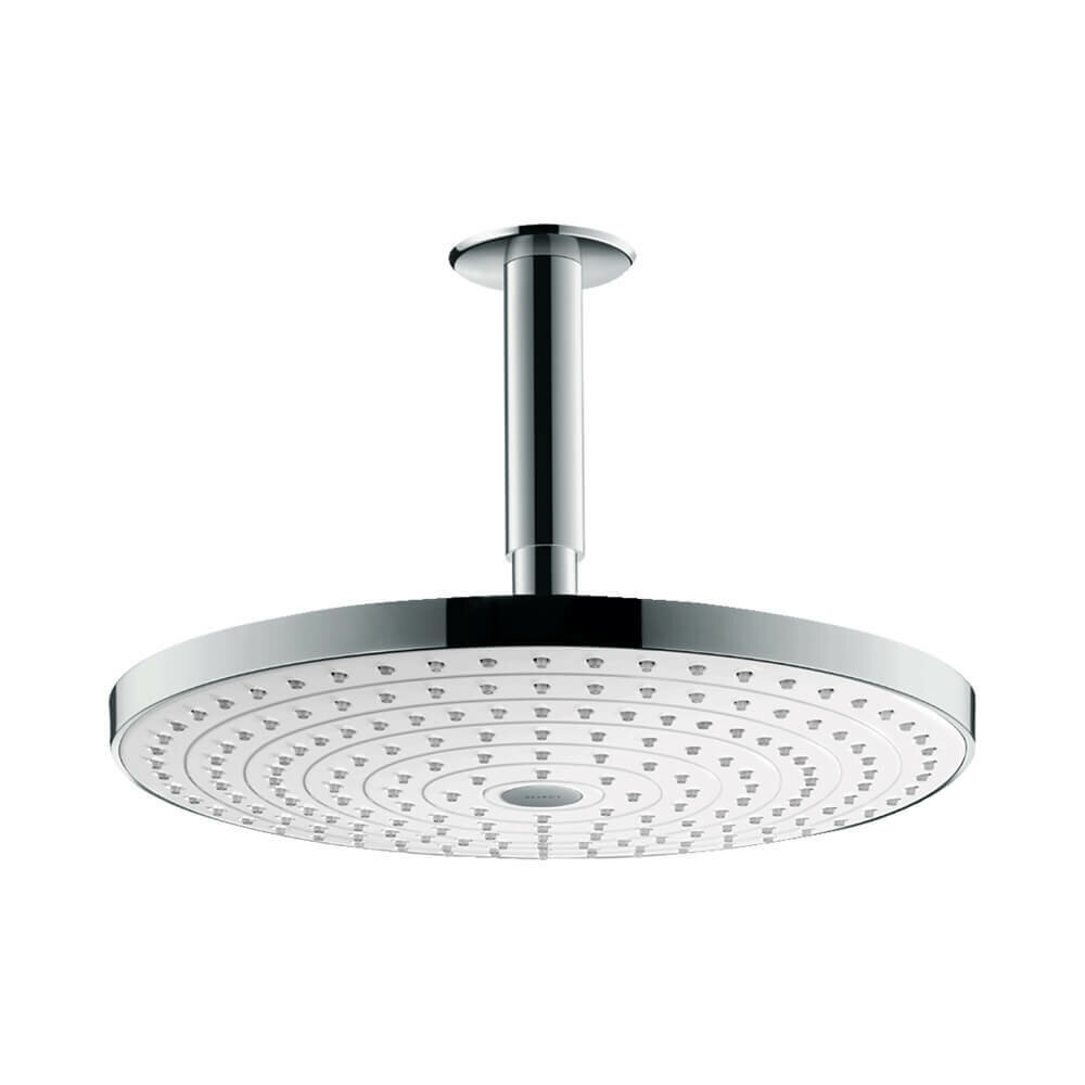 Верхний душ с потолочным креплением и возможностью регулировать угол поворота на шаровом шарнире. Над дизайном душа Hansgrohe Select работали специалисты ведущих дизайнерских студий, что делает его настоящей жемчужиной ванной комнаты. Душевой диск круглой формы Raindance Select снабжен инновационными технологиями, создающими два типа струи, а также системой защиты от известкового налета. Режимы легко переключаются нажатием кнопки Select. Помимо привычной бодрящей струи Rain, особое удовольствие обеспечит легкая обогащенная воздухом RainAir, создаваемая технологией Air Power: душевой диск своей поверхностью втягивает воздух и, смешивая его с водой, выдает легкую, обогащенную воздухом струю, имитирующую тропический дождь. Крупные мягкие капли окутывают все тело, создавая прекрасное чувство блаженства. Более эффективным становится и расход воды. Система QuickClean в виде съемных гибких силиконовых вставок, которые легко протереть, защищают душ от известкового налета.