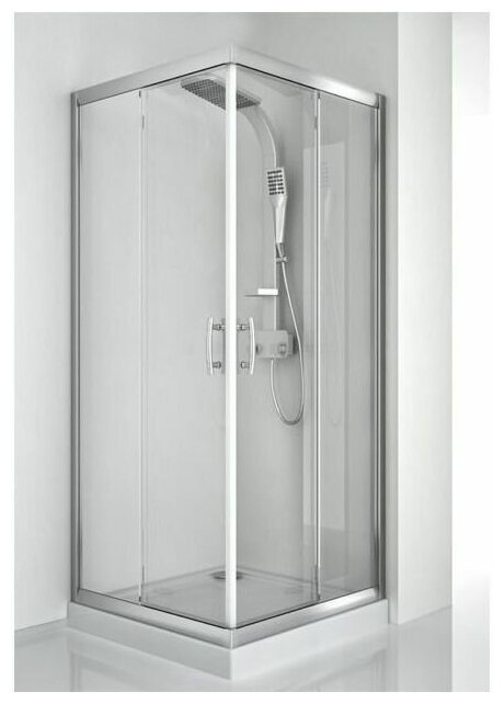 Компактный душевой уголок с раздвижными дверцами – базовая конструкция, которую вы сможете наполнить подходящим оборудованием – смесителем с душевой лейкой, душевым гарнитуром или даже полнофункциональной душевой панелью с гидромассажем. Скромные размеры кабины позволяют разместить ее даже в очень небольшой ванной комнате, а раскрывающиеся на углу дверцы экономят пространство – возле незадействованных боковых стенок можно расположить умывальник, корзину для белья, пенал, тумбу или другую мебель.