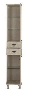 Шкаф-пенал Aquanet Тесса 35 (жасмин/сандал, фасад - стекло) можно приобрести дополнительно к базовому комплекту. Он разработан в стиле конкретной серии. Выполнен из массива дуба с натуральным шпоном и с отделкой патиной, что придает мебели налет благородной старины и делает ее похожей на антикварную. Это полноценный шкаф-колонна высотой два метра, в котором предусмотрены два выдвижных ящичка и большое пространство с полочками за распашными дверцами с доводчиками. В пенале без труда найдется место для всех атрибутов, необходимых для ванных удовольствий: полотенец, скрабов, гелей, косметических средств, щеточек, мочалок и так далее.