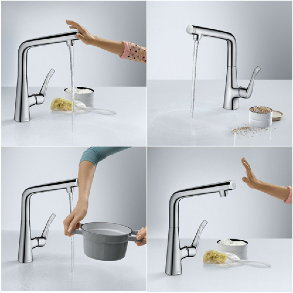 Смеситель для кухни Hansgrohe радует глаз выверенными размерами, отточенной техникой исполнения и оригинальными деталями. Чего стоит один только рычаг перключения, лихо закрученный словно фантик шоколадной конфеты! Поворотный излив можно фиксировать в трех положениях: при повороте на 110°, 150° или 360°, что очень удобно хозяйке на кухне. А еще для достижения макисмального комфорта смеситель оборудован технологией кнопочного управления Select, которая в последнее время становится все более популярной и востребованной. Она предусматривает наличие на модели кнопки, которая упрощает управление водой. В частности, на кухне кнопочное управление становится незаменимым помощником хозяйки, ведь благодаря ей руки остаются свободными, а смеситель - чистым. Кстати, эта кнопка, проверенная на надежность в научно-исследовательской лаборатории, полностью механическая и не требует подключения к электричеству. Дизайн механизма разработан студией Phoenix Design – одной из ведущих дизайнерских студий в мире. Смеситель выдает струю, которая называется ламинарной, то есть она настолько ровная, что кажется застывшей в воздухе, поскольку глаз не замечает перемещения массы воды - нет толчков, рассеивания и пульсаций. Благодаря такому направленному току воды, достигается ее значительная экономия..