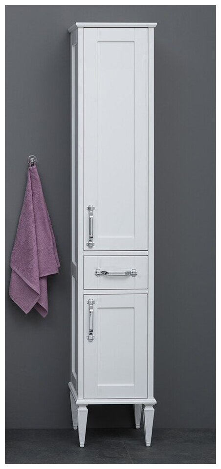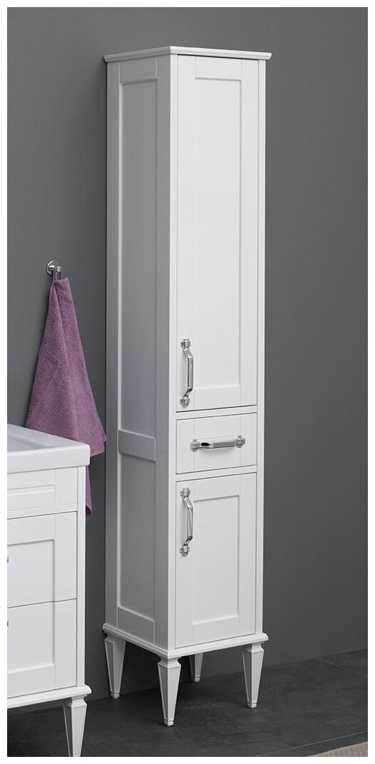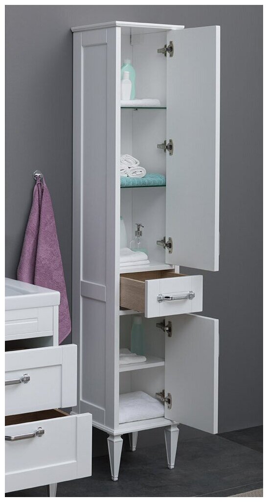 Шкаф-пенал для ванной Aquanet Денвер 36 R белого цвета по своему внешнему воплощению напоминает родственную ей модель из коллекции «Бостон». Немного отличается рисунок фрезеровки на белоснежных фасадах и фигурные ручки добавляют изделию своеобразие и живописность. Также в отличие от матовых изделий «Бостона» модели «Денвера» выполнены в глянце, что придает им торжественность, и изысканность. Зона хранения распределена по полочкам за двумя распашными дверями с правосторонним открыванием, между которыми встроен выдвижной ящик на доводчиках производства немецкой компании Hettich. В базовой комплектации тумба подвесная, но существует и вариант установки ее на ножки, причем, предлагается эксклюзивный набор деревянных ножек.