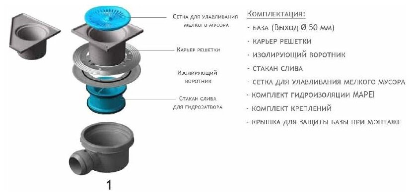 | Комплектация | база / сифон, стакан слива, кольцо гидроизоляции, металлический фланец для гидроизоляции, корпус, сетка-улавливатель, решетка, комплект креплений, защитная крышка |