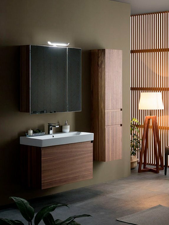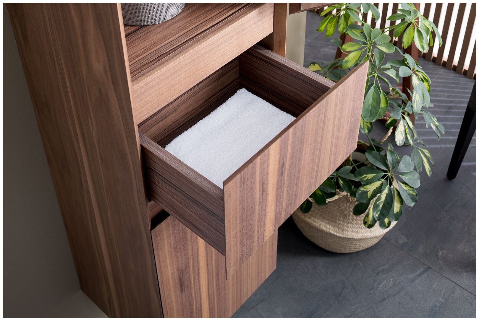 Шкаф-пенал для ванной Aquanet Нью-Йорк 35 (орех) не нуждается в дополнительных декоративных деталях, живописной фурнитуре – шпон ореха, используемый в качестве покрытия, выполняет функции декорирования наилучшим образом. А для открывания дверок пенала и выдвижения ящичка торцевые детали фасадов снабжены специальными скосами, что превращает их в удобный элемент открывания. Это и есть так популярные сейчас интегрированные ручки. Корпус традиционно для мебели Aquanet выполнен из влагостойкой ЛДСП, фасады – из МДФ. Пенал имеет универсальный способ установки, то есть его можно подвесить, а можно и установить на ножки. Он предоставляет дополнительные места хранения к базовому комплекту мебели, в который входит только тумба и зеркальный шкафчик. Зона хранения пенала шириной 35 см и высотой 162,5 см распределена по пяти полочкам, скрытым за двумя распашными дверцами и ящичком, расположенным между ними.