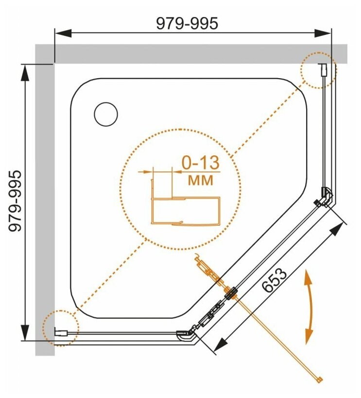 При неровностях стены профиль регулируется +/- 1,5 см (98,5 - 100 см)х(98,5 - 100 см).