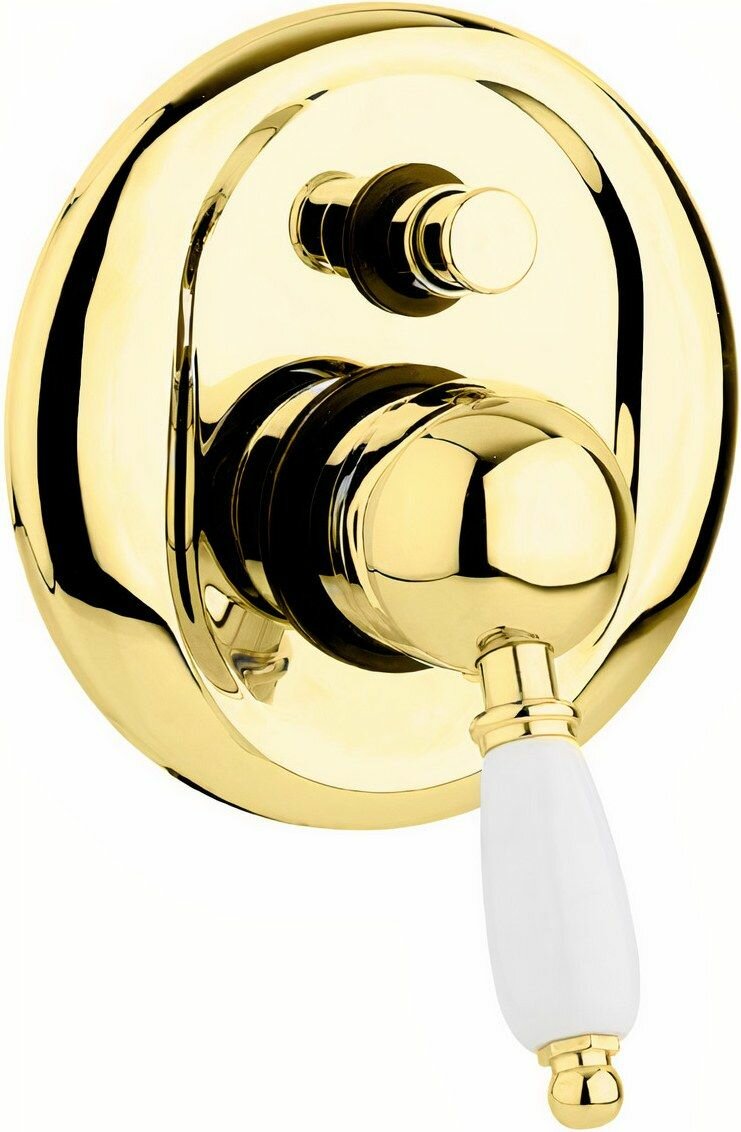 Встраиваемый однорычажный смеситель для душа с переключателем. Исполнение: Золото 24 карат. Ручки: Белая. Излив отсутствует. Размер розетки: 15,6 см. Ширина: 15,6 см. Механизм: керамический картридж. Отверстия для монтажа: 1 отверстие. Тип подводки: внутренний (скрытый) монтаж 1/2". Оснащение: скрытая монтажная часть, дивертор. Внутренняя часть входит в комплект.
