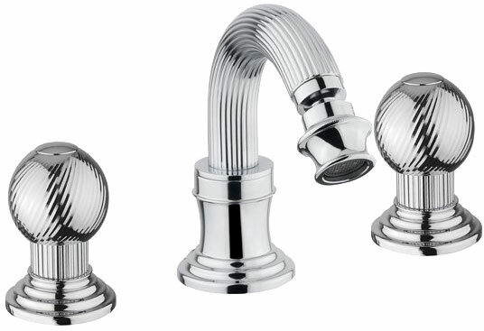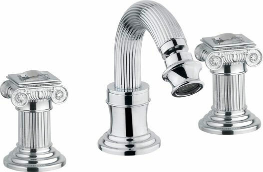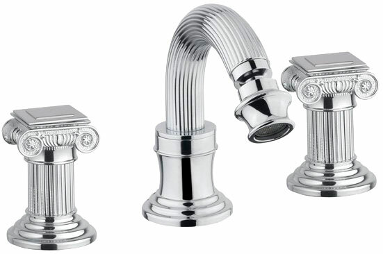 с донным клапаном. Артикул: OLIMP-BBS2-02-O. Сочетает в себе инновационные технологии и продуманный до мелочей дизайн. Смеситель отличается изящным исполнением ручек и корпуса, напоминающих элементы античных колонн с плавными изгибами и скульптурными спиралями.