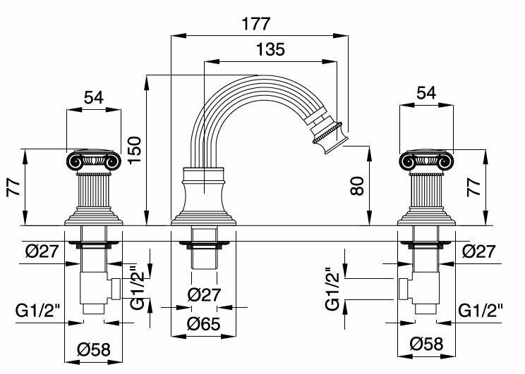 с донным клапаном. Артикул: OLIMP-BBS2-02-M. Сочетает в себе инновационные технологии и продуманный до мелочей дизайн. Смеситель отличается изящным исполнением ручек и корпуса, напоминающих элементы античных колонн с плавными изгибами и скульптурными спиралями.