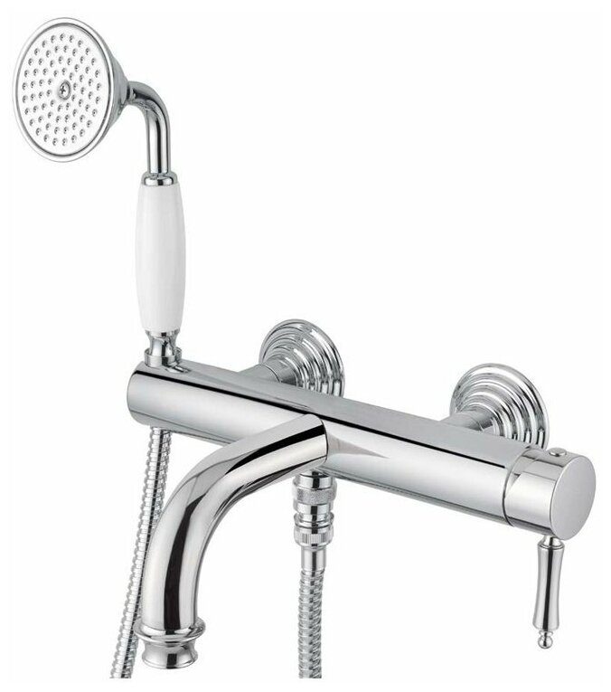 Смеситель для ванны и душа однорычажный в комплекте с ручным душем. Исполнение: Золото 24 карат. Ручки: Белая. Механизм: керамическая кран-букса. Отверстия для монтажа: 2 отверстия. Тип подводки: 1/2". Оснащение: эксцентрики, аэратор, девиатор, ручной душ, душевой шланг, держатель.