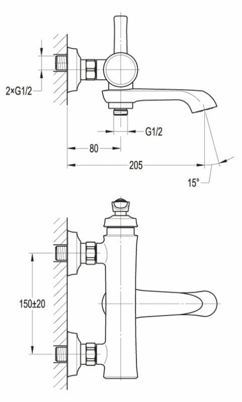 Смеситель для ванны и душа. Исполнение: Хром. Ручки: Хром. Длина излива: 20,5 см. Механизм: керамический картридж. Отверстия для монтажа: 2 отверстия. Тип подводки: 1/2". Оснащение: эксцентрики, аэратор.