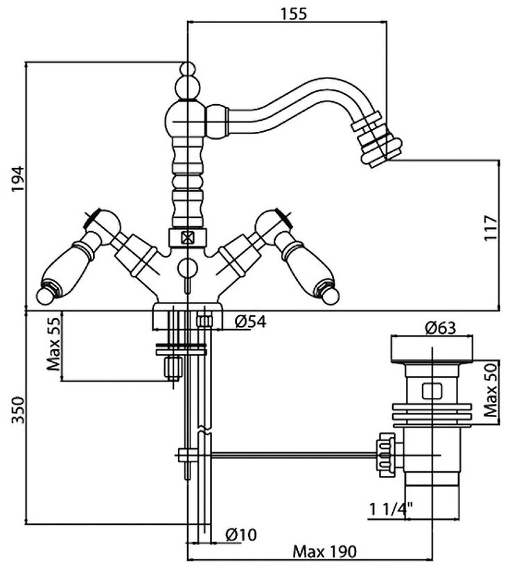 Донный клапан: G 1 1/4. Рычаг управления на корпусе смесителя.