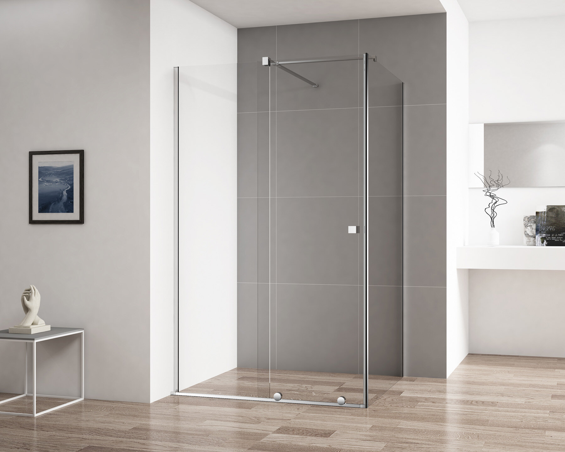 Безпрофильное ограждение, нижние ролики, позаботятся о плавной и бесшумной фиксации двери.