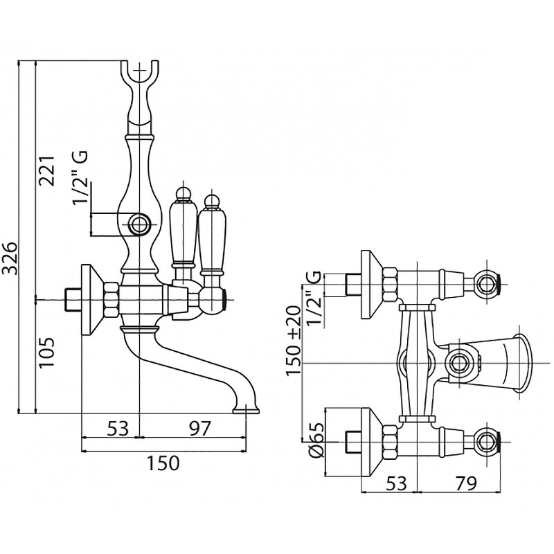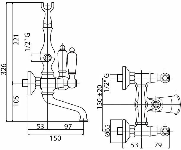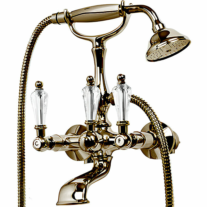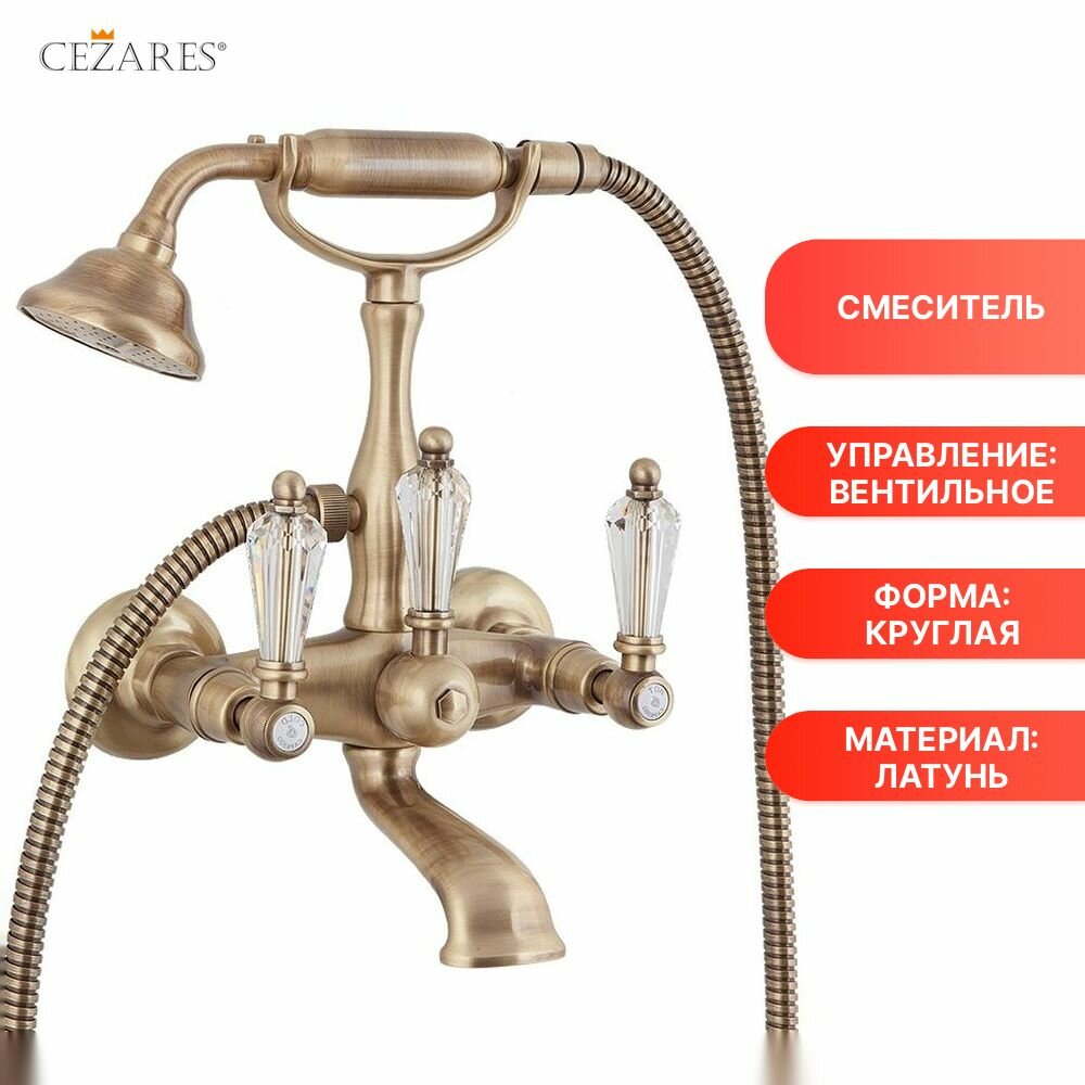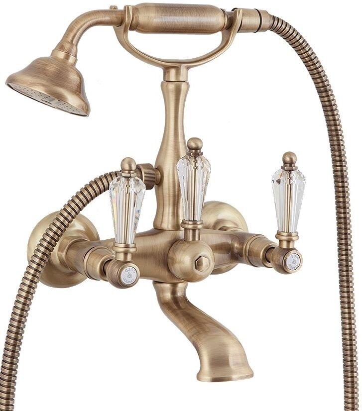 Смеситель для ванны с ручным душем. Исполнение: Бронза. Ручки: Swarovski. Длина излива: 15 см. Механизм: керамическая кран-букса. Отверстия для монтажа: 2 отверстия. Тип подводки: 1/2". Оснащение: душевой шланг, душевая лейка, держатель для душевой лейки.