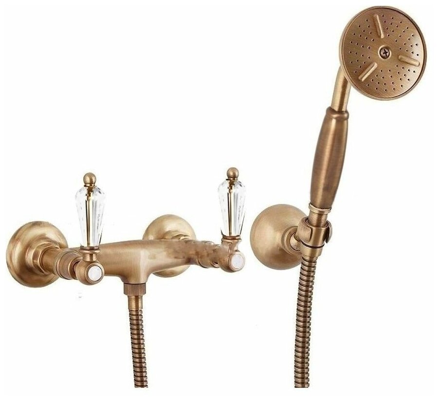 Смеситель для душа с ручным душем, шлангом 150см и держателем. Исполнение: Бронза. Ручки: Swarovski. Излив отсутствует. Механизм: керамическая кран-букса. Отверстия для монтажа: 2 отверстия. Тип подводки: 1/2". Длина шланга: 150 см. Оснащение: душевой шланг, душевая лейка, настенный держатель.