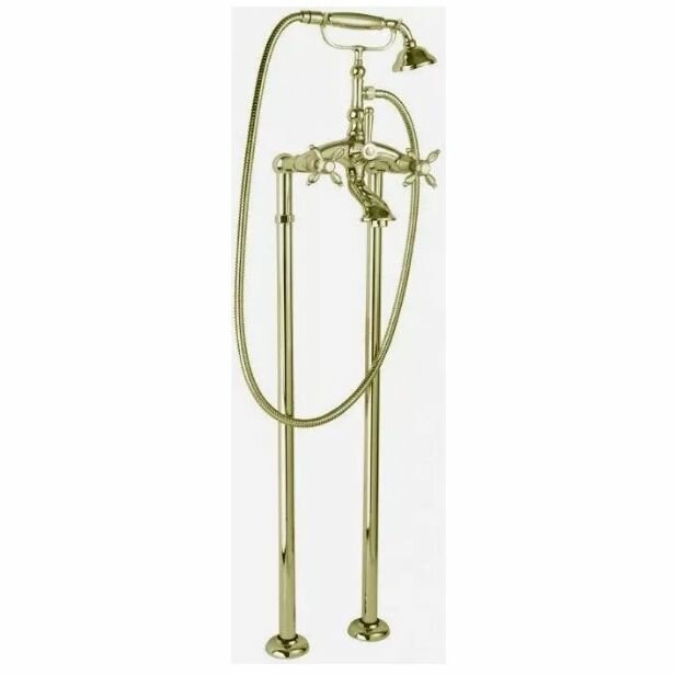 Напольный смеситель для ванны с ручным душем. Исполнение: Золото 24 карат. Ручки: Золото 24 карат. Длина излива: 20,8 см. Механизм: керамическая кран-букса. Отверстия для монтажа: 2 отверстия. Тип подводки: 1/2". Оснащение: душевой шланг, душевая лейка, универсальный установочный комплект.