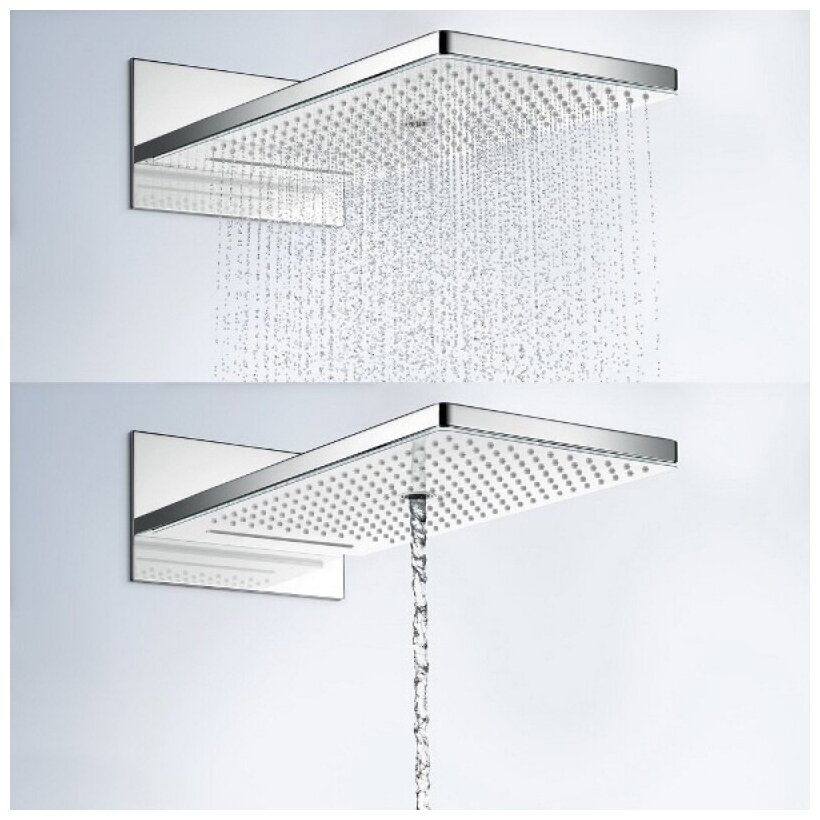 Верхний душ Hansgrohe Select 580 3jet 24001400, тип струи: Rain, Rainflow Waterfall, Mono, расход воды для струи Rain (при 3 бар): 17 л/мин, расход воды для струи Mono (при 3 бар): 20 л/мин, расход воды для ливневой струи (при 3 бар): 17 л/мин, управление тремя зонами струй осуществляется посредством трех вентилей или одного переключающего вентиля с тремя ответвлениями, легкоочищаемый душевой диск, материал душевого диска: безопасное стекло, съемный душевой диск для очистки, монтаж: стена, скрытый монтаж с помощью iBox Universal.