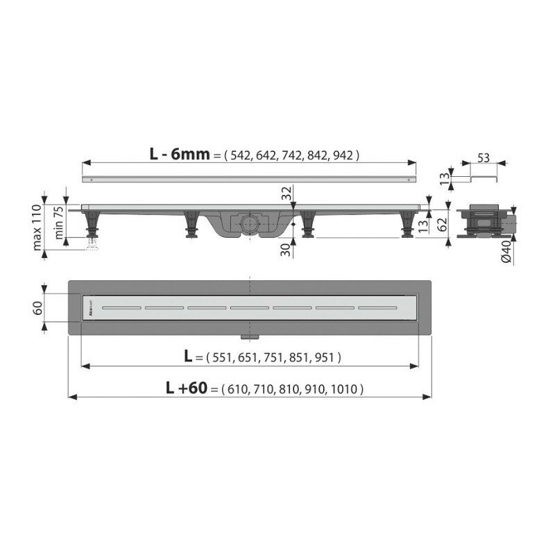 | Дополнительная информация | желоб с порогами из нержавеющей стали, общая высота монтажа 75-110 мм |