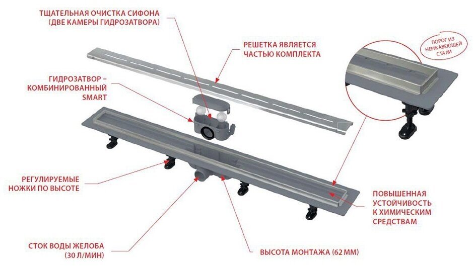Пластиковый желоб с порогами из нержавеющей стали, которые плотно зафиксированы по всему периметру. Сливные трапы из особопрочного пластика, который устойчив к морозам и химии. Высота монтажа от 62 мм. Регулируемые монтажные ножки 0–35 мм, позволяют быстро и удобно установить желоб и выровнять его в горизонтальной плоскости. Повышенная устойчивость к химическим средствам. Идеальная совместимость с гидроизоляцией здания. Комбинированный гидрозатвор (собственное запатентованное решение) обеспечивает надежную защиту от проникновения запаха из канализации и после испарения воды в сифоне. Вручную легко чистящийся сифон, вплоть до сточной трубы. Решетка является частью комплекта. Самоклеящиеся ленты для качественной гидроизоляции. Материал: полипропилен обогащенный тальком, устойчив к механическим, химическим и термическим повреждениям