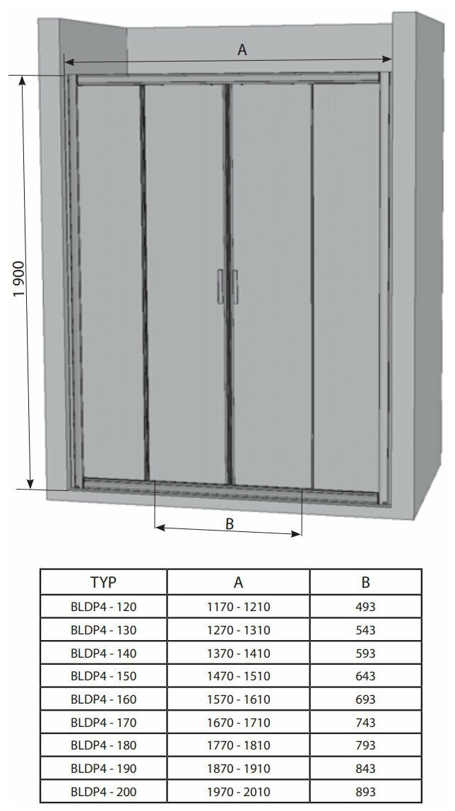 Душевая дверь в нишу Ravak Blix BLDP4 160 раздвижная. Состоит из двух фиксированных и двух подвижных частей. Регулировка установочной ширины: 1570-1610 мм. Витраж из безопасного стекла толщиной 6 мм.