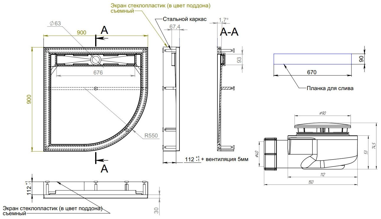 | Комплектация | Душевой поддон, Сварной по периметру каркас, Панель для поддона, Сифон с гидрозатвором, Декоративная накладка слива |