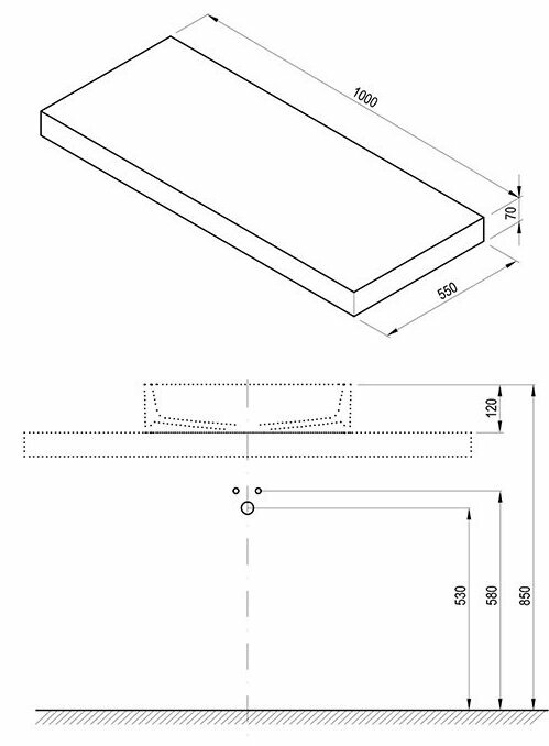 Универсальная столешница, подходящая под большинство умывальников. Представлена в трех цветах и трех материалах, поставляется без просверленного отверстия.