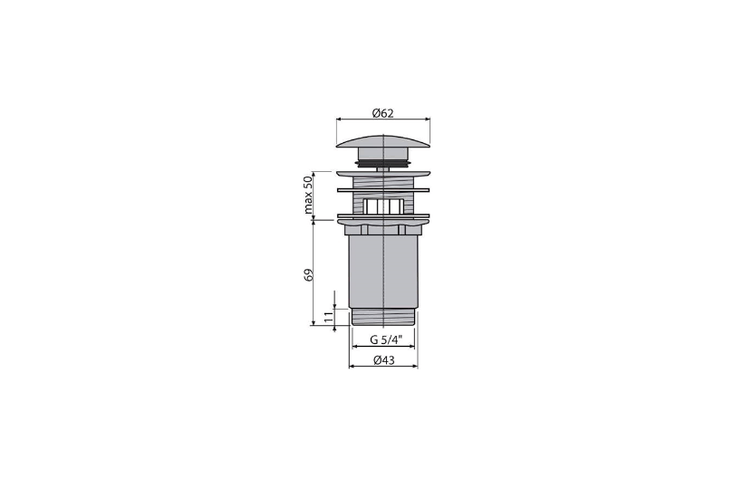 Донный клапан Alcaplast CLICK/CLACK 5/4, цельнометаллический с переливом и большой белой заглушкой.