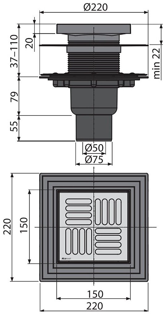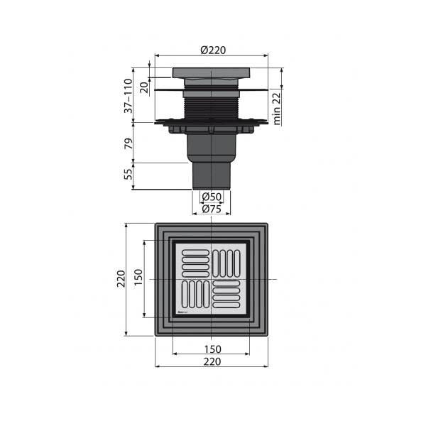 AlcaPlast представляет собой сливной трап с прямым стоком, решеткой и фланцем из нержавеющей стали и воротником изоляции 2–го уровня. Возможно использование сухого или мокрого гидрозатвора. Гидрозатвор препятствует проникновению запаха из канализации.