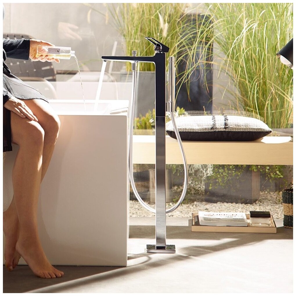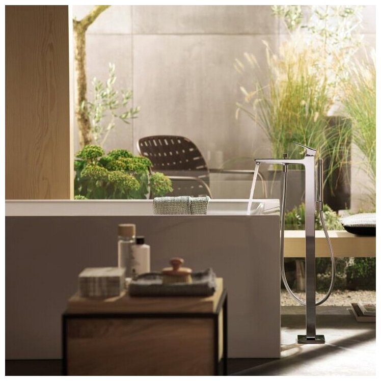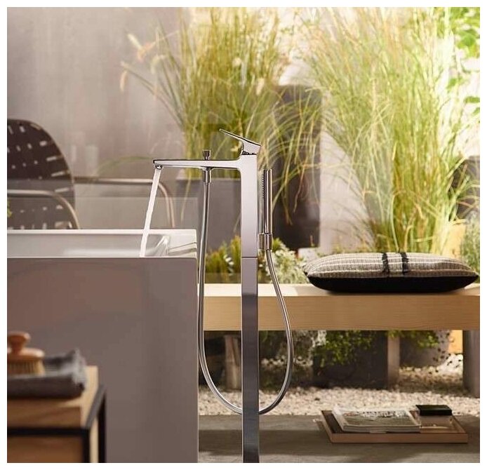 Напольный смеситель для ванны Hansgrohe – нестандартное решение для ванной комнаты. Модель может выступать в качестве полезного бытового элемента, а также играть роль декоративной составляющей помещения. Конструкция может быть установлена около ванной или же использоваться совместно с напольными умывальниками. Это универсальное решение с высокими качественными показателями.