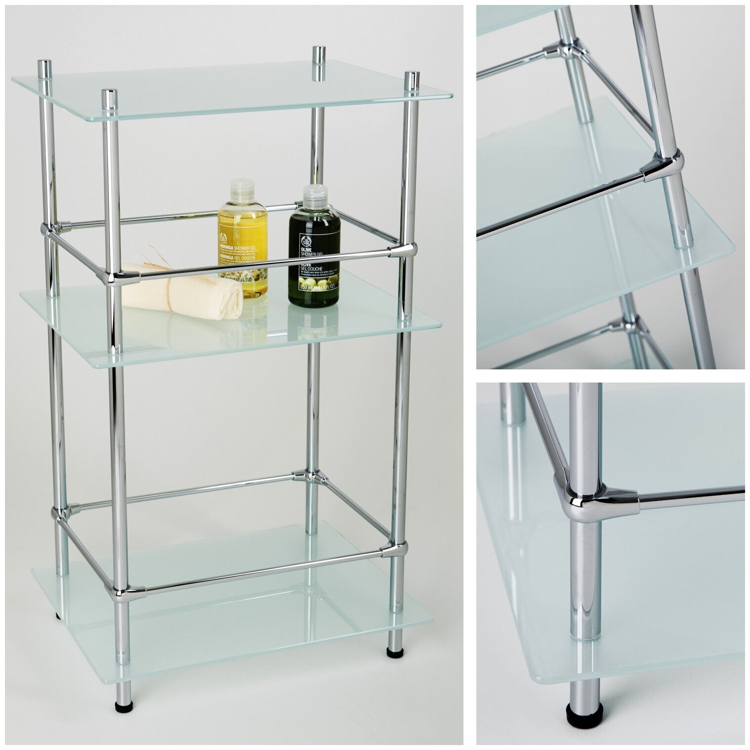 Напольная стеклянная тройная полка с бортиком. Материалы: металл, хромоникелевое покрытие, уплотнительные пластиковые кольца, закаленное матовое стекло.