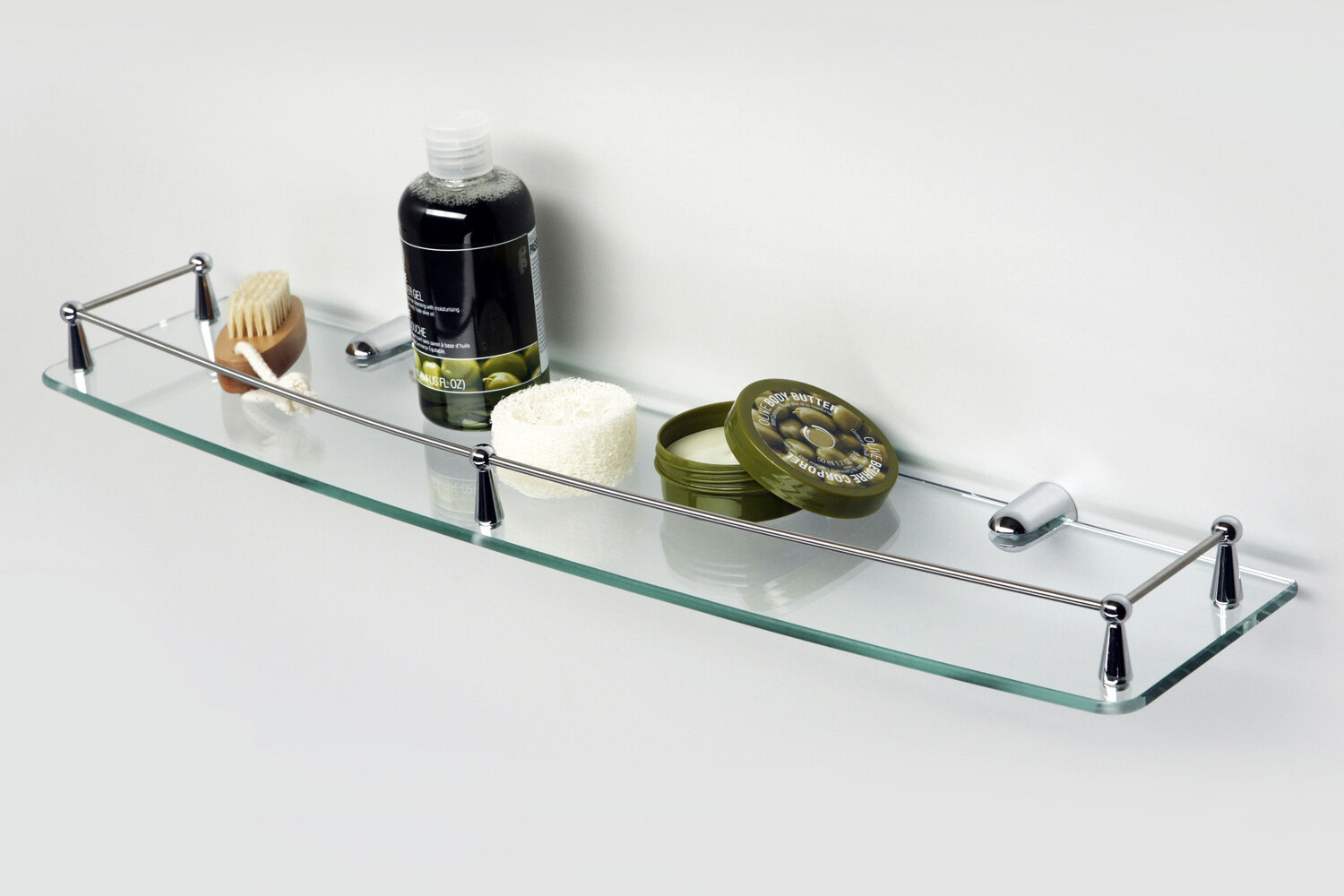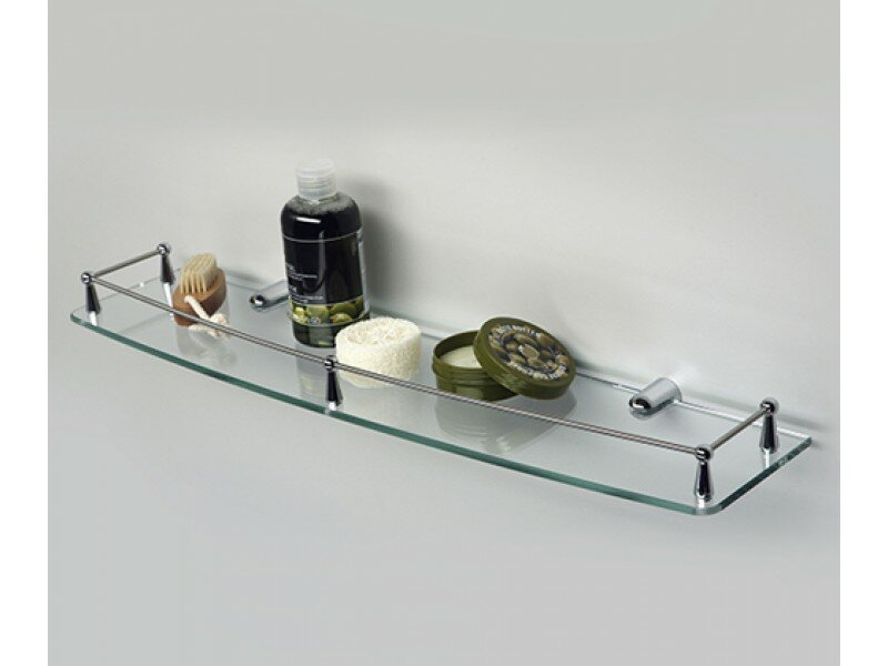 Полка стеклянная. Материалы: металл, хромоникелевое покрытие, уплотнительные пластиковые кольца, закаленное стекло.