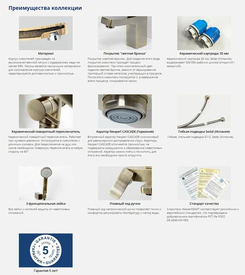 Долгий срок службы. В смесителе используется керамический картридж 35 мм, выдерживающий 500 000 рабочих циклов (открытий и закрытий).