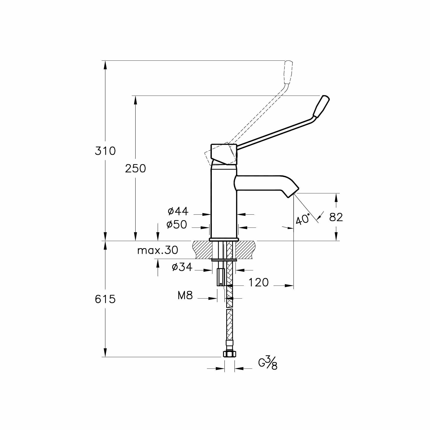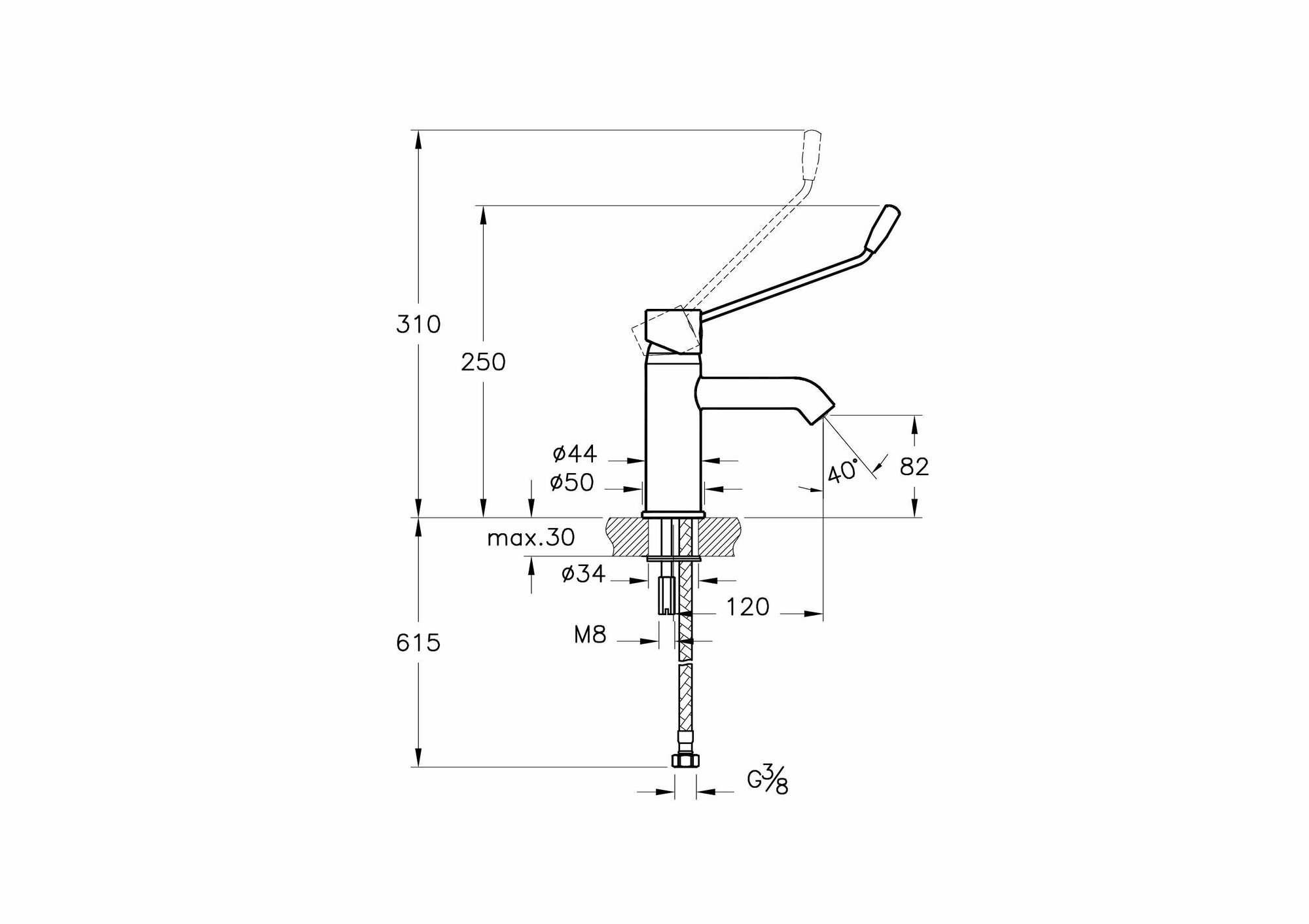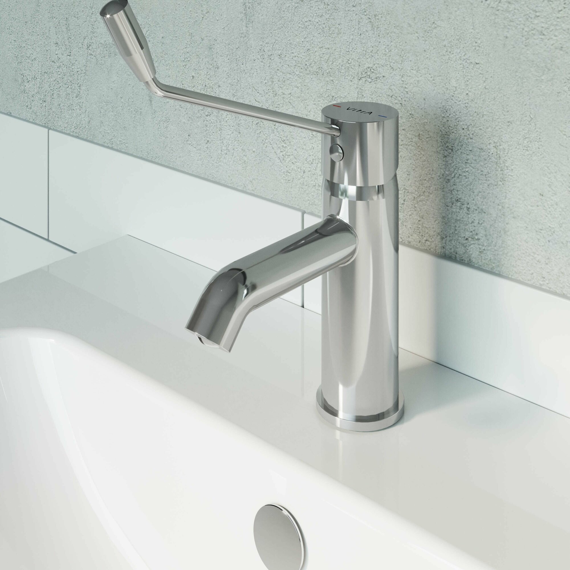 Удлиненная ручка смесителя для локтевого управления и удобства использования людьми с ограниченными возможностями.