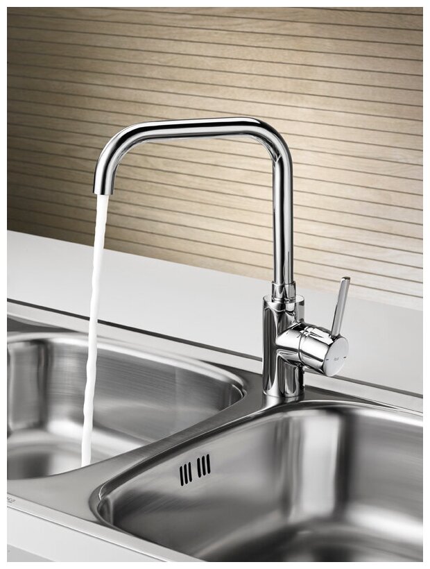 Roca - смеситель для кухни. Инновационные ультрасовременные линии, также, как и более классический и простой дизайн, удовлетворяют любой вкус и потребности.Высокий и длинный поворотный излив с аэратором делает мытье посуды простым и комфортным занятием.