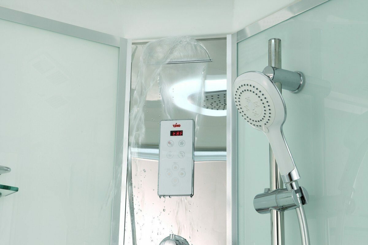 Timo Comfort T-8802L Fabric Glass душевая кабина (120*85*220), Комплектация: сенсорная панель управления, FM радио, подсветка верхняя, электр. вентиляция; стеклянная полочка; термостатический четырехрежимный смеситель. Поддон: 100% цельный акрил армирован стекловолокном, на усиленном каркасе. Сливная система clik-clak. Сифон 50mm. Экран. Задние стенки: закаленное ударопрочное стекло 5мм, светлого оттенка. Передние стекла: матовое (Fabric Glass), 5мм, закаленное, ударопрочное. Конструкция дверей: раздвижная. Центральная панель выполнена из полированной нержавеющей стали. Крыша: акриловая. Ролики, ручки: хромированные из металлической стали. Профиль: анодированный, алюминиевый, хромированный, глянцевый.