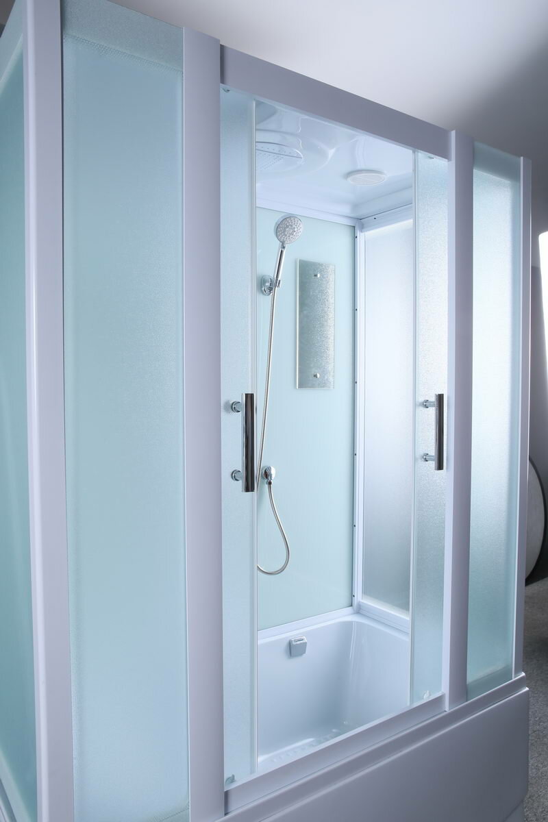 Акриловый поддон h - 60 см. Съемный экран из трех частей. Хромированный слив-перелив П/А с сифоном. Алюминиевый профиль - БЕЛЫЙ МАТОВЫЙ. Задние стенки - стеклянные белые. Передние и боковые стекла - структурные матовые. Сенсорный пульт управления. Подсветка верхняя. FM-радио. Вентиляция. Смеситель однорычажный - четыре режима. Тропический душ. Массажная лейка. Гидромассаж спины 6 джет. Наполнитель ванны. Саморегулирующие ролики. Стеклянная полочка. Зеркало. Ручки. Собирается изнутри. БЕЗ СИЛИКОНОВАЯ СБОРКА!!!