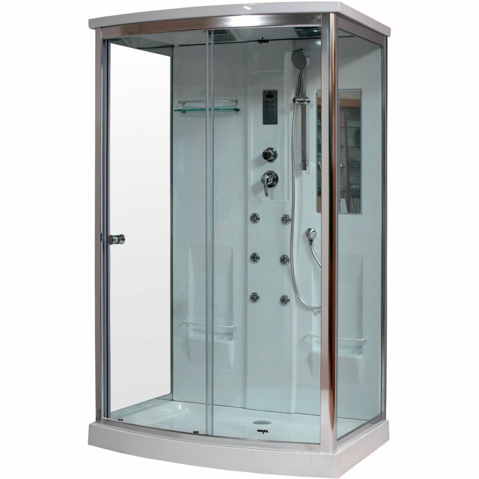 1200х900х2250 - Акриловый поддон h - 15 см. с сифоном и усиленным каркасом. Акриловая армированная, монолитная задняя стенка. Анодированный, алюминиевый, хромированный профиль. Закаленное ударопрочное безопасное стекло толщиной 6 мм. Сенсорный пульт управления. Подсветка верхняя. FM-радио. Вентиляция. Смеситель однорычажный - три режима. Тропический душ. Лейка. Гидромассаж спины 6 джет. Двойные ролики. Стеклянные полочки. Зеркало. Ручки.
