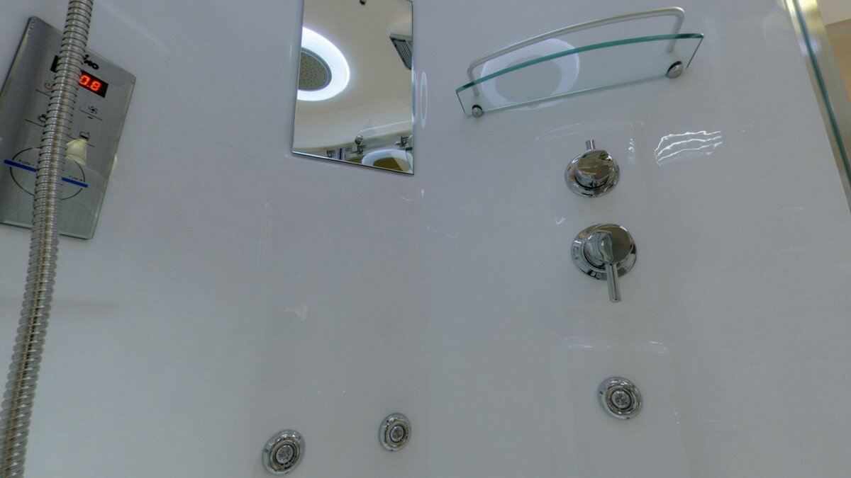 1200х850х2200 мм, правый. Акриловый поддон h - 48 см. Съемный экран. Сливная система clik-clak с сифоном. Акриловая армированная, монолитная задняя стенка. Анодированный, алюминиевый, хромированный профиль. Закаленное ударопрочное безопасное стекло толщиной 6 мм. Сенсорный пульт управления. Подсветка верхняя. FM-радио. Вентиляция. Смеситель однорычажный - четыре режима. Тропический душ. Лейка. Раздельный гидромассаж спины 6 джет + 6 джет. Двойные ролики. Стеклянные полочки. Зеркало. Ручки.